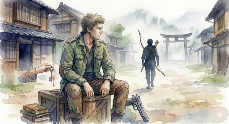 初登場からの伏線服装や持ち物が現代的すぎること。村人との適度な距離感。