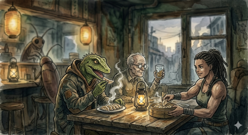 ニカイドウが経営する食堂「空腹虫(ハングリーバグ)」は、ホールの中でも特に治安が悪く、魔法使いが頻繁に出没する危険な地域に位置しています。