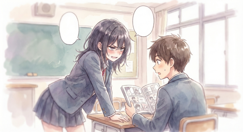 - 照れ線の表現: 頬を染める斜線(照れ線)の書き込み量が、感情のボルテージと比例している。