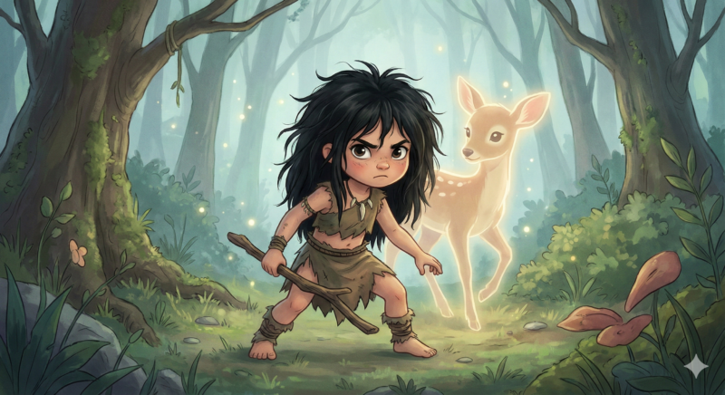 ボサボサの黒髪の間から覗く瞳は、警戒心と純粋さが同居しており、まるで小動物のような愛らしさを感じさせます。