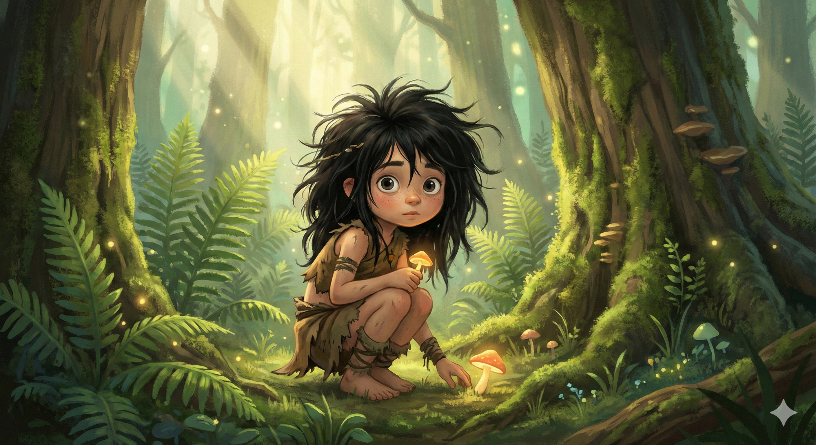 ボサボサの黒髪の間から覗く瞳は、警戒心と純粋さが同居しており、まるで小動物のような愛らしさを感じさせます。
