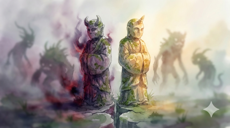 - 偽りの平和の象徴: 村人(影森家の監視者たち)にとっては、左右様はただの「動かない石像」だと思われていた。