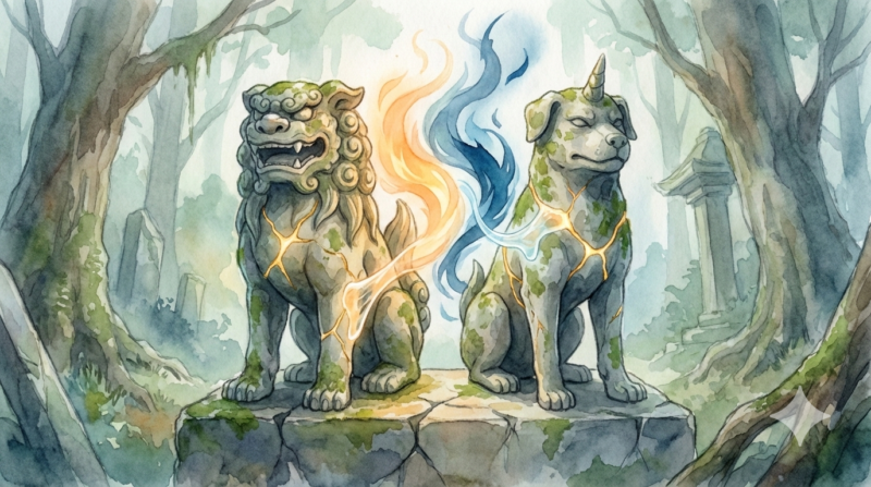- 「阿吽」の融合説: 宇宙の始まり(阿)と終わり(吽)を象徴する2体が、物語の最終局面で一つに融合し、黄泉と現世の境界を書き換えるほどの神格的ツガイになるという説。
