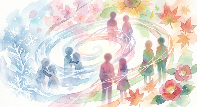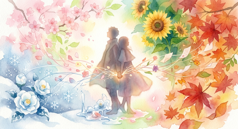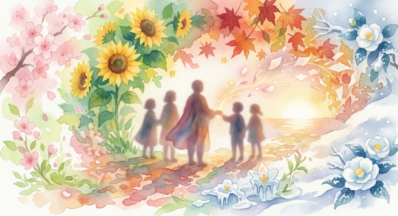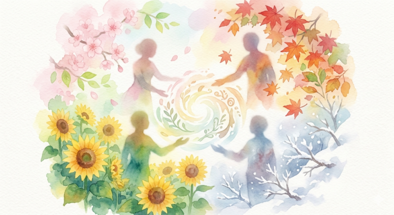 やがて大地の願いによって「夏」と「秋」も誕生し、美しい四季が完成したとされています。