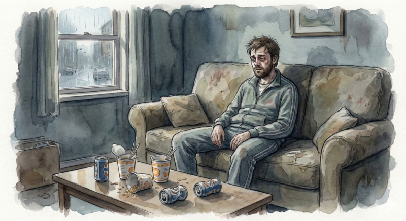 同世代がキャリアを築いたり家庭を持ったりする中で、彼は安酒を煽り、パチンコで時間を潰し、危険手当の安い討伐任務で日銭を稼ぐ日々。