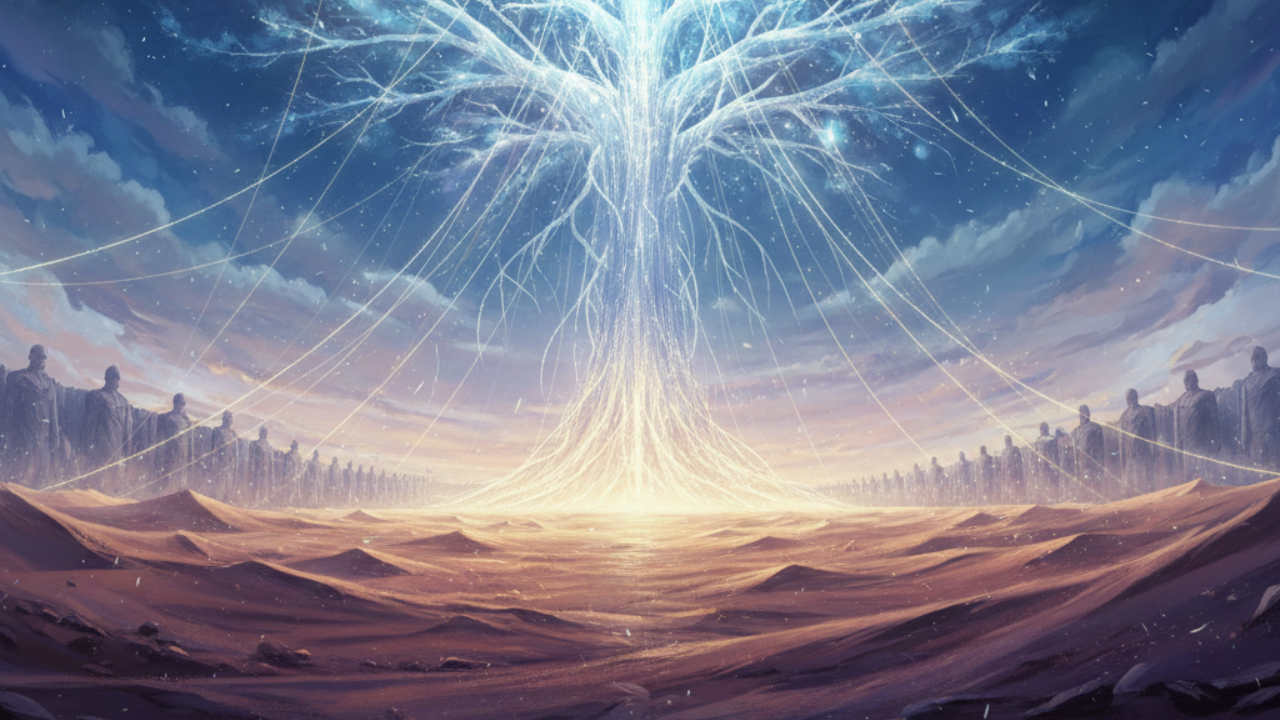 座標の空間は、見渡す限りの砂漠と、天を突くような光の樹として描写されています。